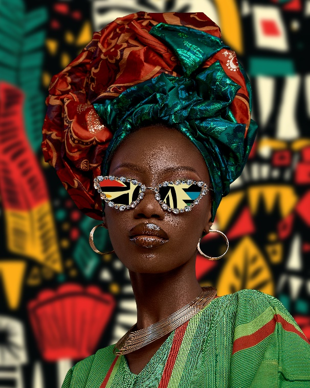 The dignity of women is visually represented by the grace of the gele. The model was depicted by the artist wearing a vibrant gele that was expertly knotted around her head. The model is photographed against the vibrant background of an ankara, or African print fabric. This ankara fabric’s reflection is also visible on the model’s eyeglasses. The model’s gele sits flawlessly, giving her a majestic appearance and serving as a visual representation of what a proud, black African lady looks like.