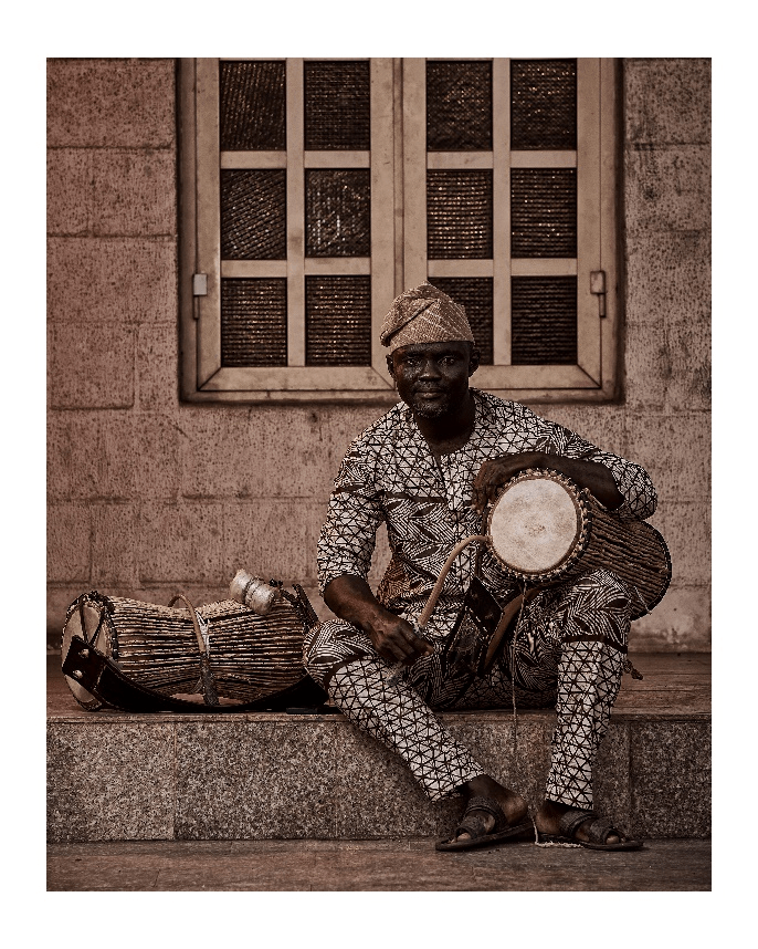“Minds behind the talking drum” is the third project that caught my attention. The Yoruba culture is another source of influence for this. An elderly man poses with a talking drum in these two pictures. The talking drum an ancient form of drum indigenous to the yorubas. The image is straightforward but powerful; in my opinion, the artist’s primary goal was to highlight and photograph the men behind the talking drum rather than the instrument itself. Their comfortable and drum in tune facial expressions were captured in the picture. Additionally, both males are dressed in traditional Yoruba attire.