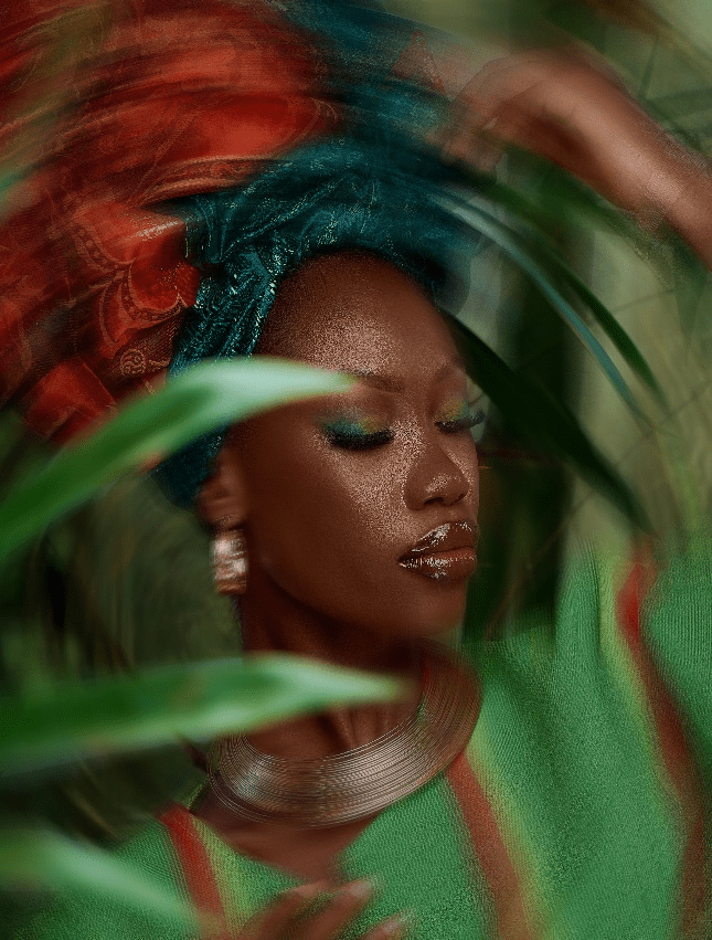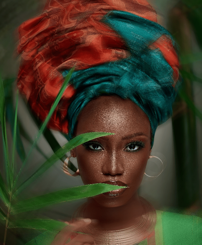 Beauty enveloped in colors is another intriguing piece of art; like all of Ogundunsin’s previous artworks, this series only has two pieces. The model is wearing her gele in the artwork. The photo has been altered somewhat surrealistically. The artwork discusses the model’s and gele’s beauty. The parallels between this piece and the Gele’s grace are evident.
